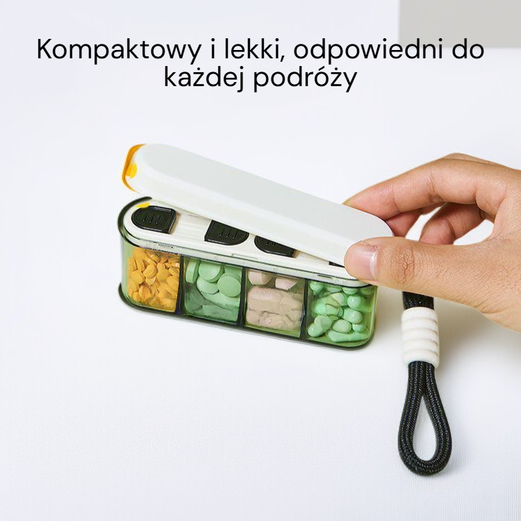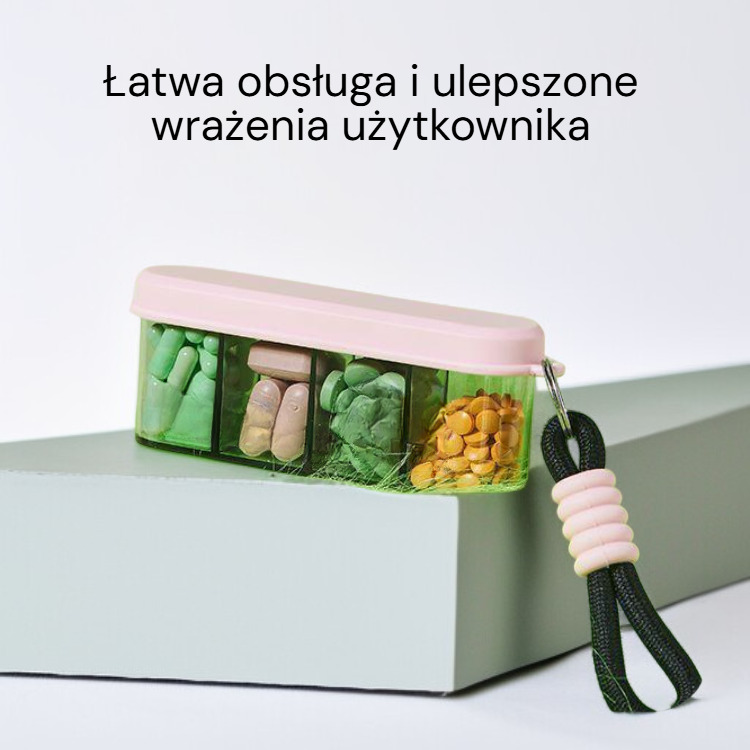 ● Przenośny pojemnik na leki umożliwia wygodne i bezpieczne przechowywanie tabletek podczas podróży, dzięki kompaktowym rozmiarom zmieści się w każdej torbie.